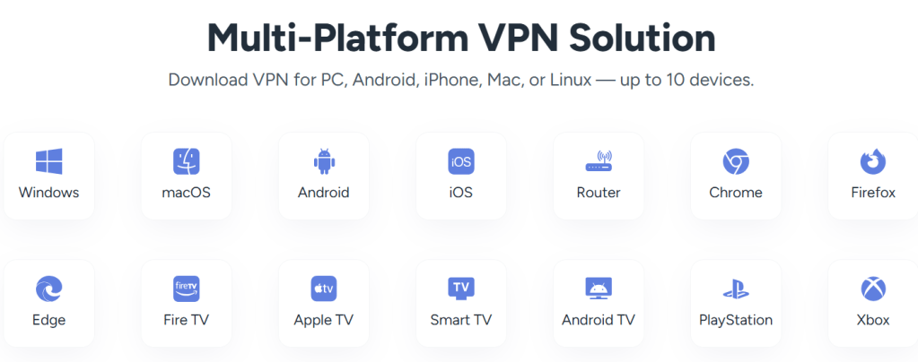 Platform: Windows, macOS, Linux, iOS, Android, Chrome, Firefox, Edge, Smart TVs, Fire TV, Apple TV, Android TV, PlayStation, Xbox, Routers.
