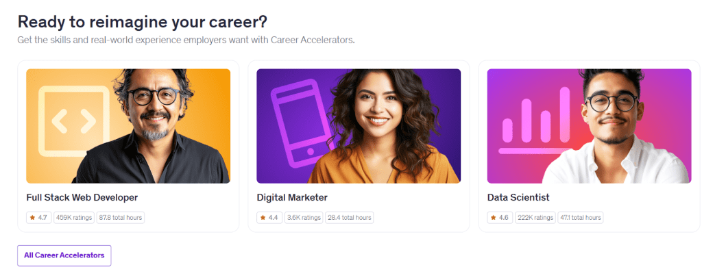 Udacity offers Nanodegree programs with structured projects, mentor feedback, and career support. Prices are higher, and plans are usually monthly with bundle discounts. Udemy is better if you want lower-cost entry and a larger selection for quick upskilling, while Udacity suits learners who want intensive, project-heavy programs at a premium.